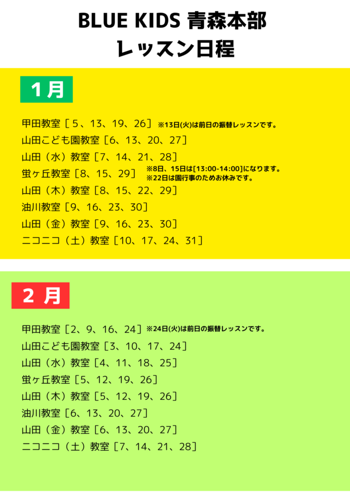 1、2月のレッスン予定【青森支部】